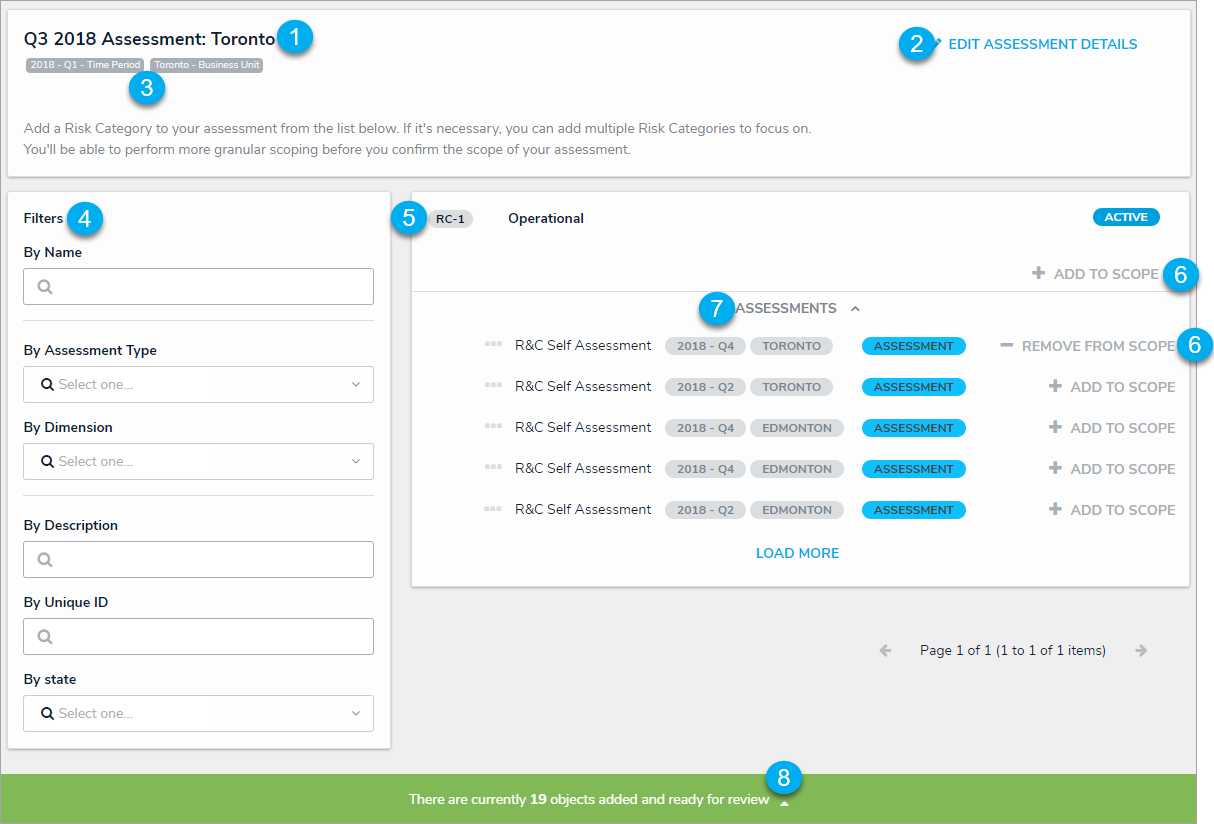 - The Add To Scope and Remove From Scope buttons to add or remove objects and instances from the assessment.