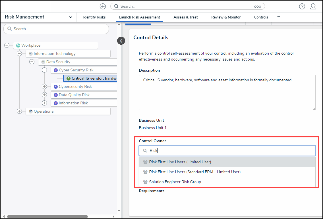 From the Controls Details tab, enter a User or User Group name in the Control Owner field and select a user or user group from the dropdown menu. Multiple control owners can be assigned to a single control.