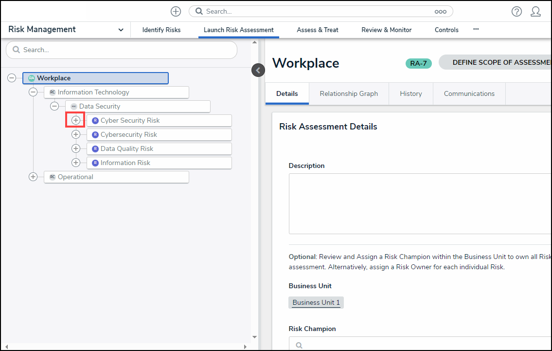 From the Risk Assessment screen, click on the Expand icon next to a Risk (R) node on the Navigation Tree.