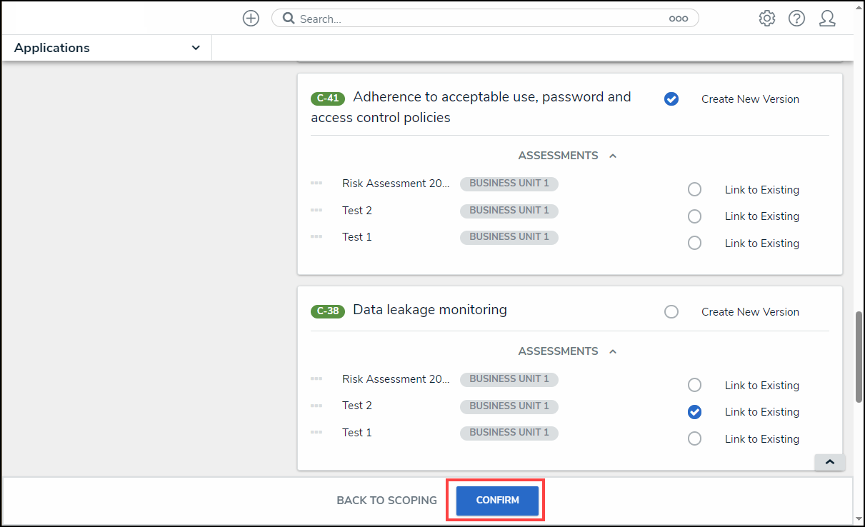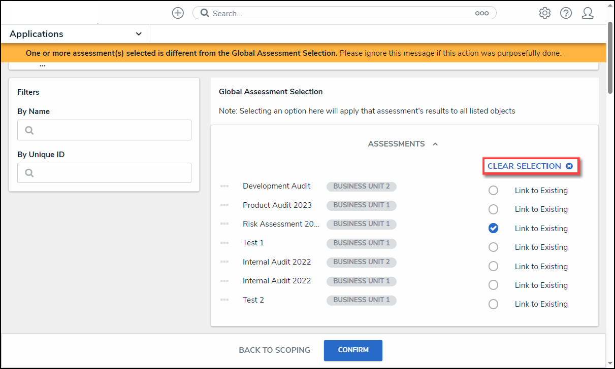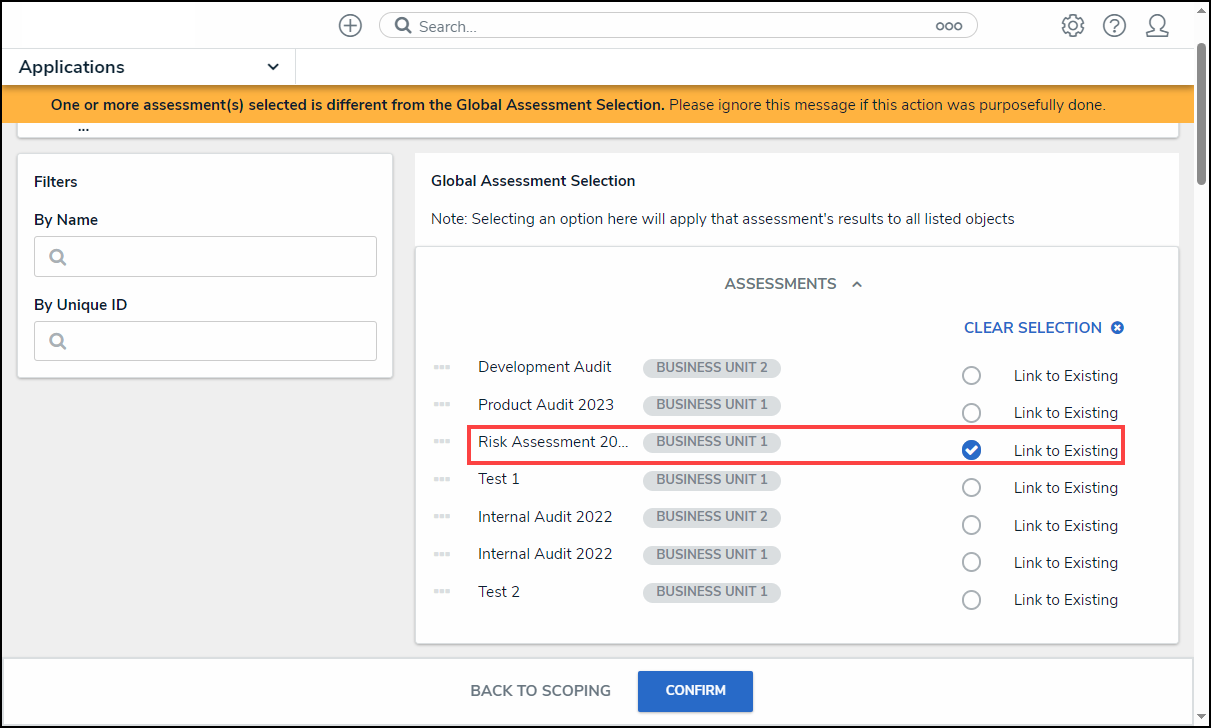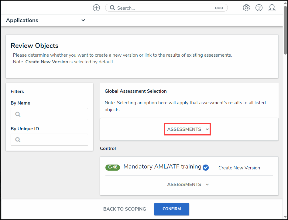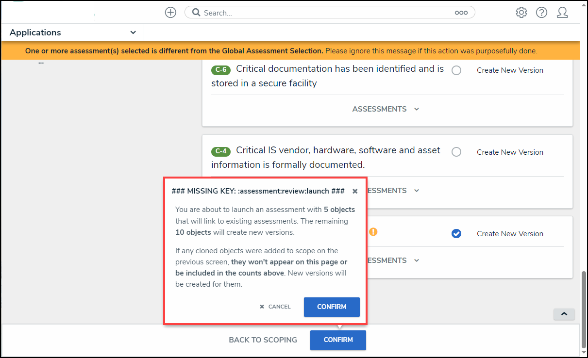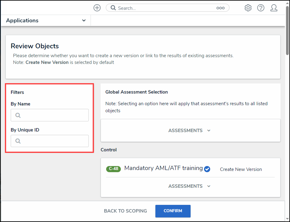 When the Link to Existing feature is activated by an Administrator on the Configuration tab on the Admin: Editing Assessment screen, confirming a scope on a Risk Assessment by clicking the Confirm Scope button will open the Review Objects screen, allowing the user to review the data before the assessment is launched.