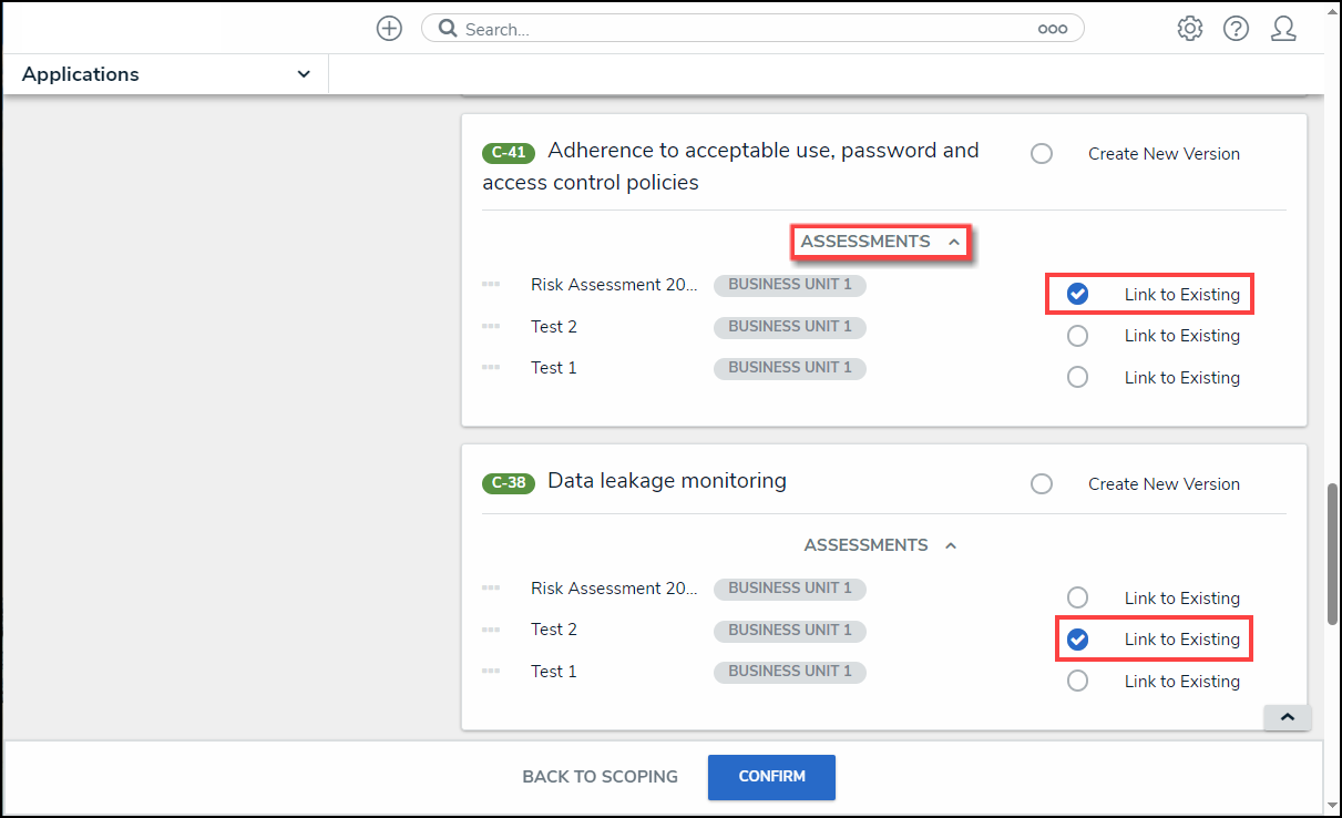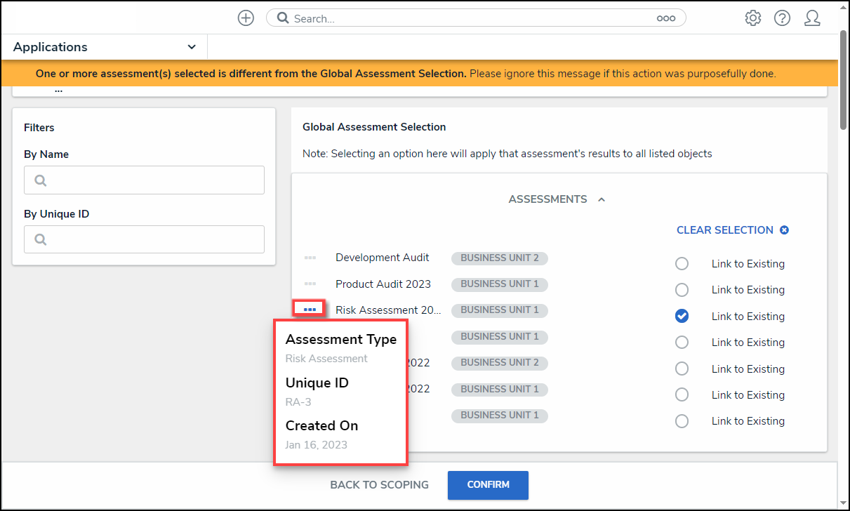- Users can also scroll through the Objects and manually apply a different assessment to each object by clicking the Assessment link and selecting the Link to Existing radio button next to a previous assessment.