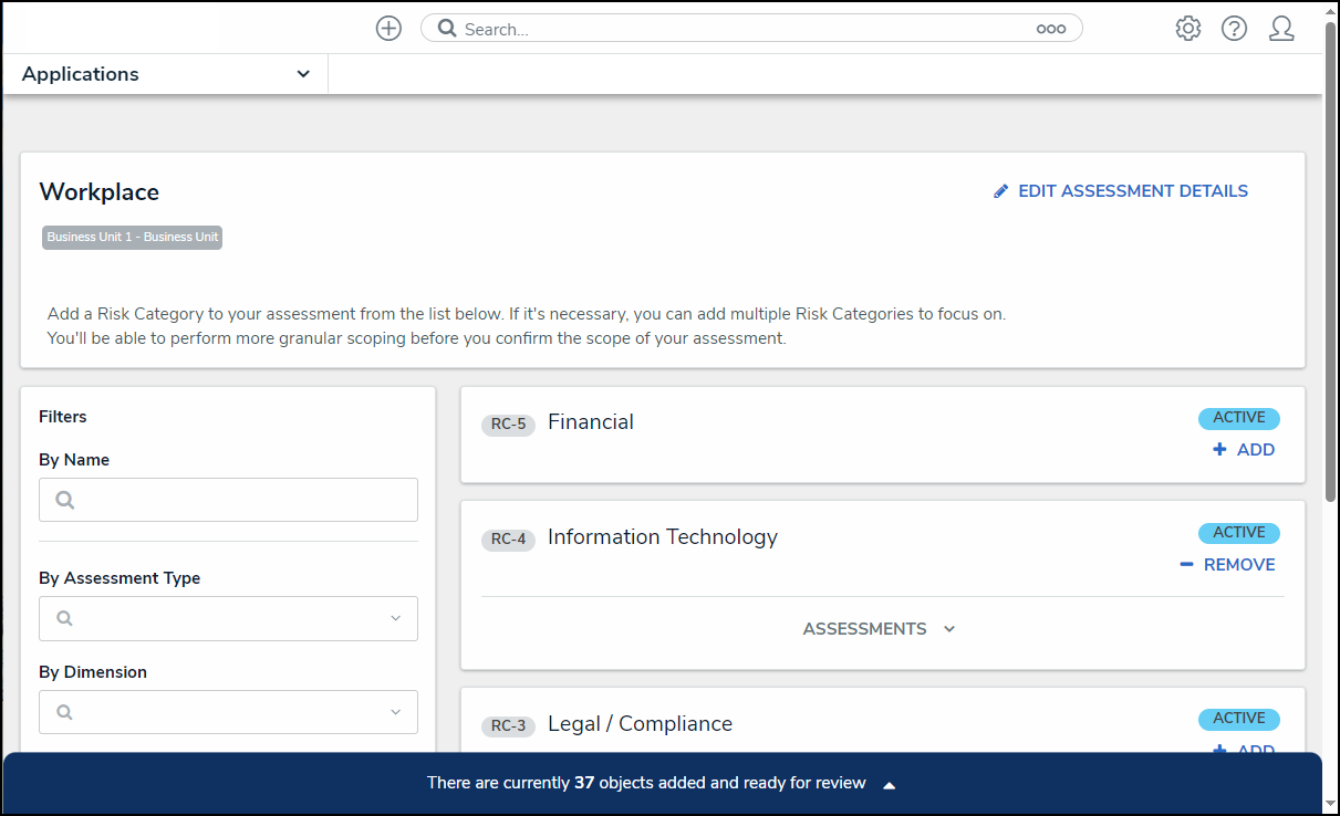 After a user creates a Risk Assessment and scopes it for launch, the Review Objects screen will appear if the Link to Existing feature is activated. Please refer to the Activating the Link to Existing Feature for more information on how to navigate to the Review Objects screen.