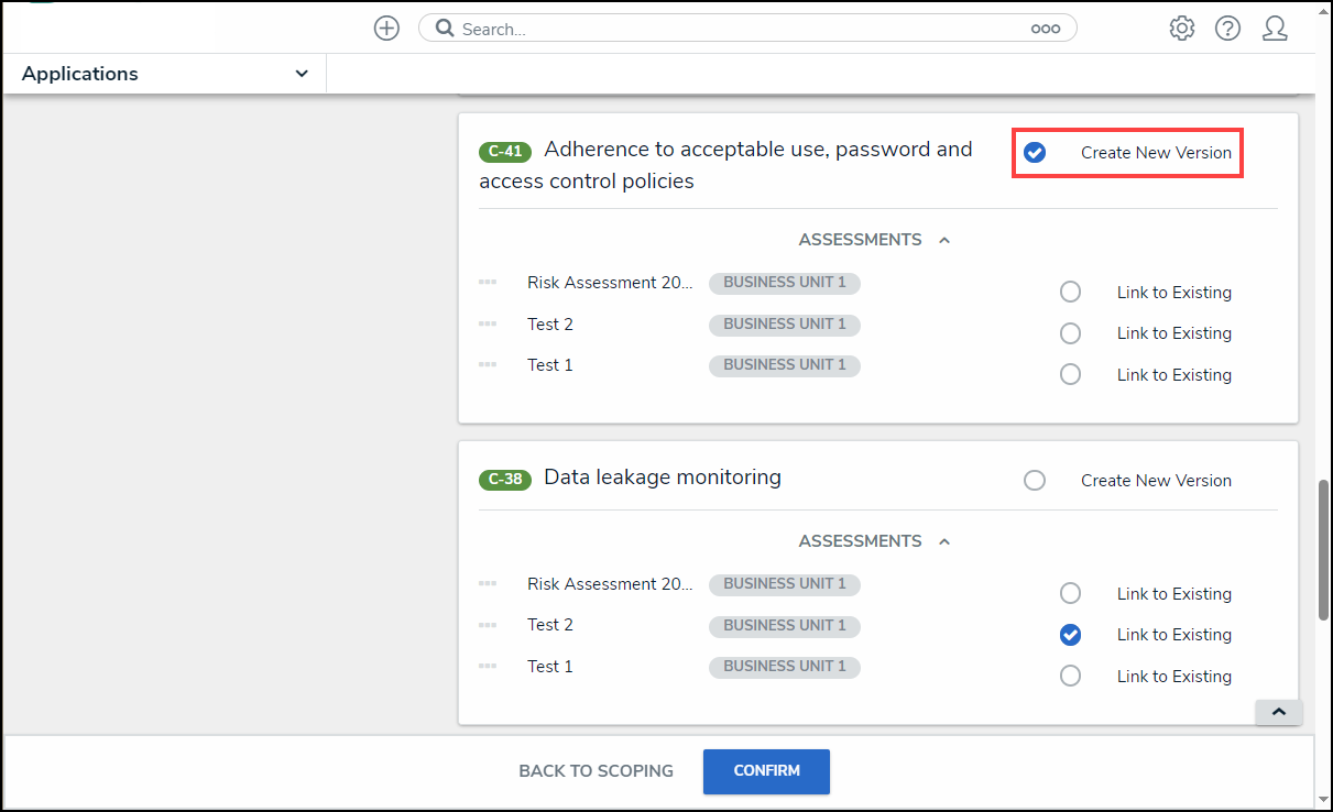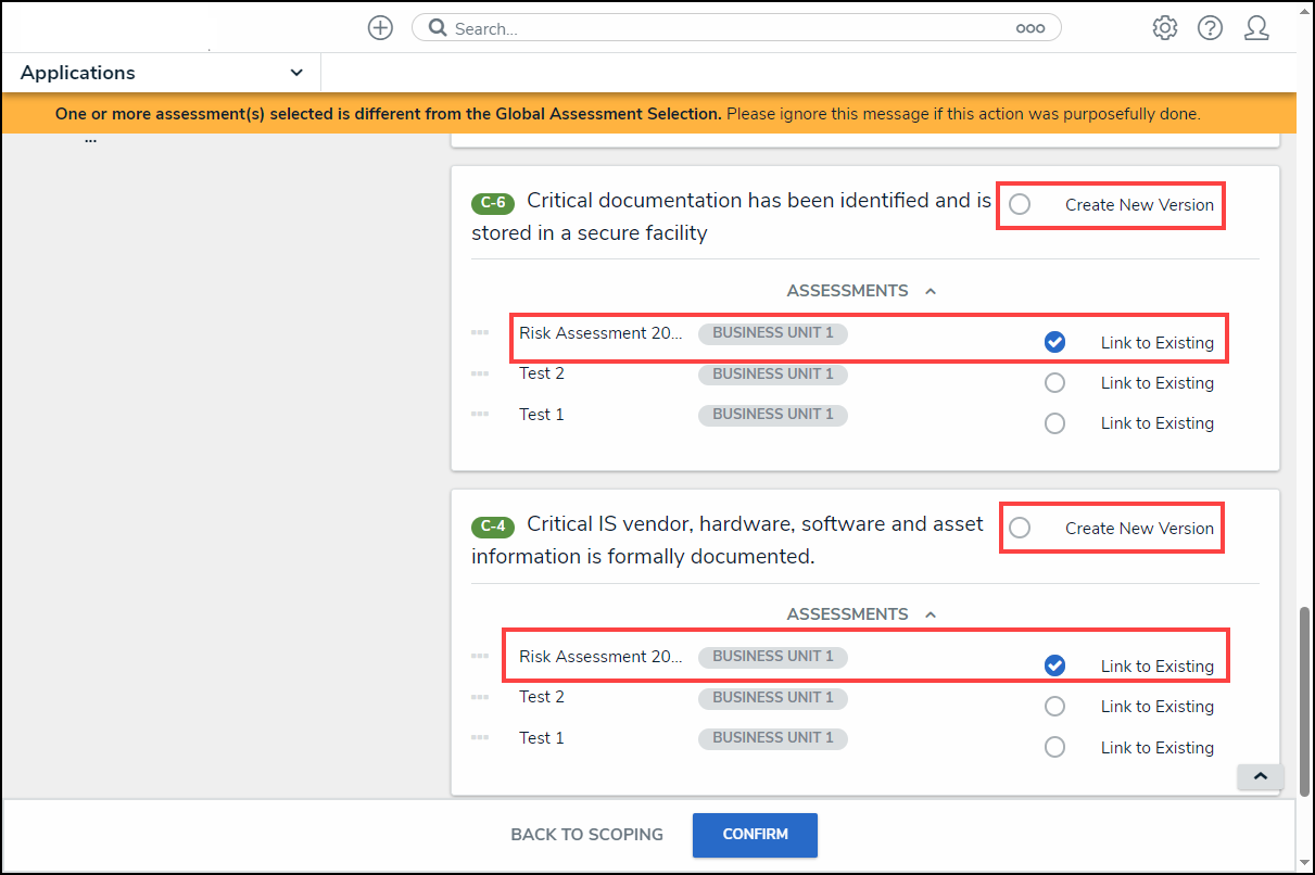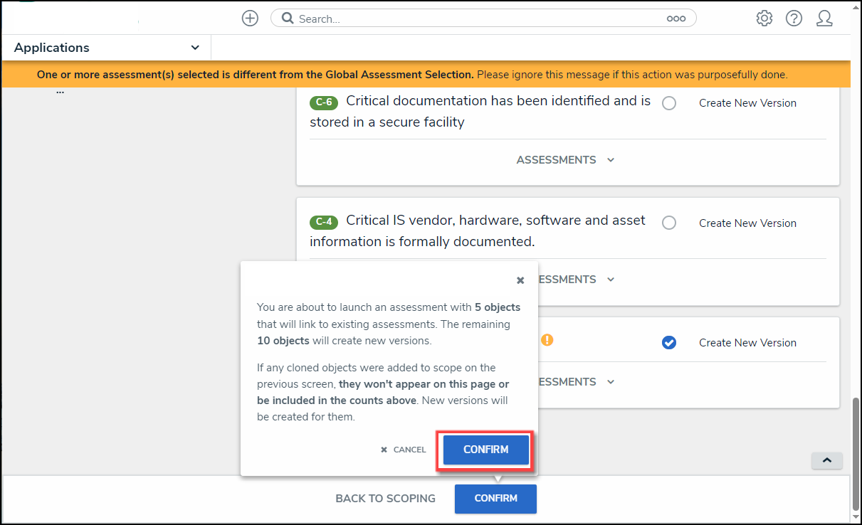 - Once the user has selected whether to create a new assessment (clicked Create New Version radio button) or to use a previous assessment (select previous assessment radio button) for each Object they can click the Confirm button.