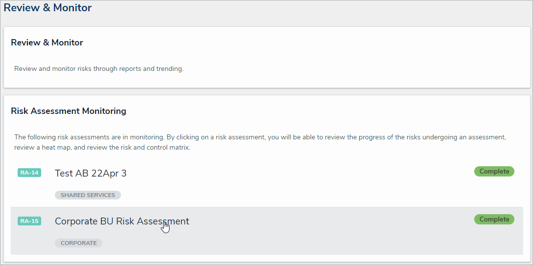 In the Risk Assessment Review and Monitoring activity, click an assessment in the Complete state to open the Risk Assessment form.