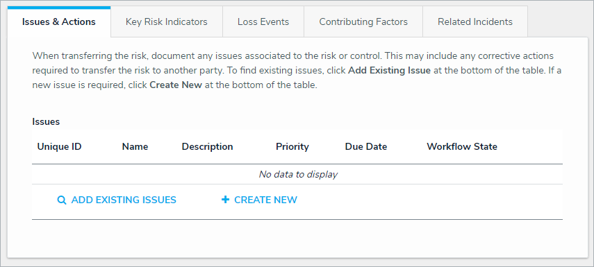 - In the Issues & Actions section, an existing contributing issue can be added by clicking Add Existing Issue, typing its name in the search bar, and selecting it. To create a new issue from scratch, click + Create New and fill in the required fields. Read more here: Review an Issue and Review a Corrective Action.