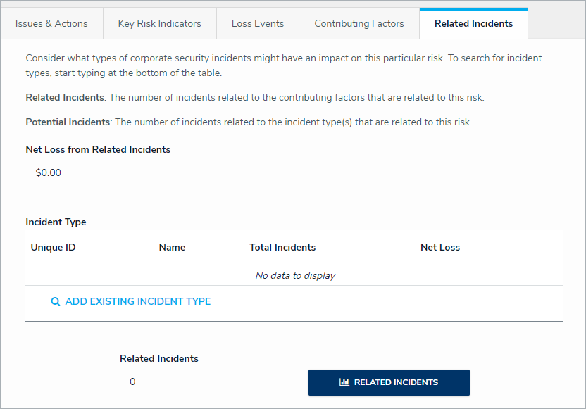 - Optional: Click the Related Incidents tab to review any incident types attached to this risk. An existing incident type can be added by typing its name in the search bar and selecting it.