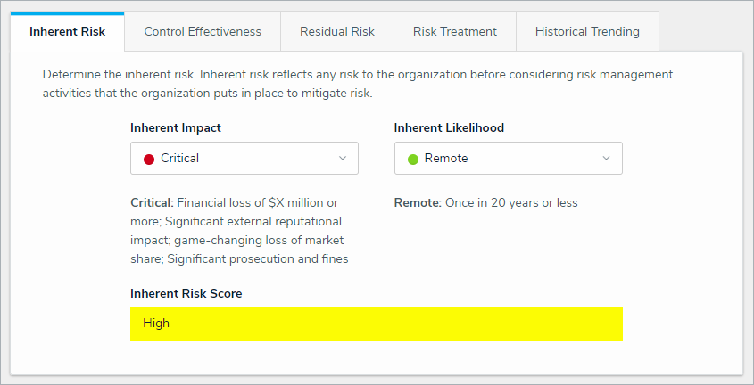 In the Inherent Risk tab, select the relevant ratings from the Inherent Impact and Inherent Likelihood fields to generate an inherent risk score.