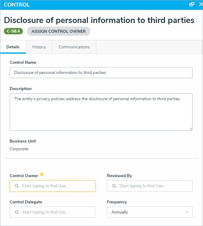- Begin typing in the Control Owner and Control Delegate fields and click to select the relevant user.
