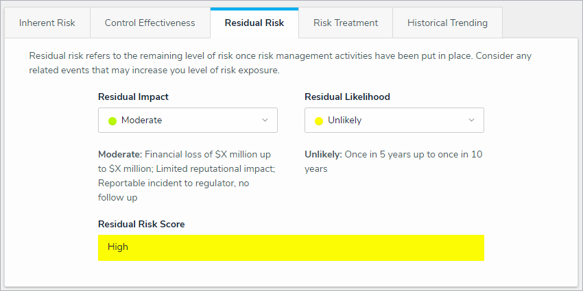 While this may vary between organizations, it is recommended that the Risk Team create KRIs and assign them to indicator owners. However, the Risk Owner also has this capability. - In the Residual Risk section: Select the relevant ratings from the Residual Impact and Residual Likelihood fields to generate a residual risk score.