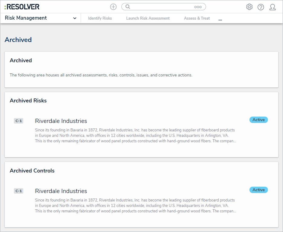 Users who have been granted temporary access to the Administrator (Risk Management) user group can also access the Archive activity in the Risk Management App. This activity allows the user to review all relevant Risk Management App objects that have been archived.