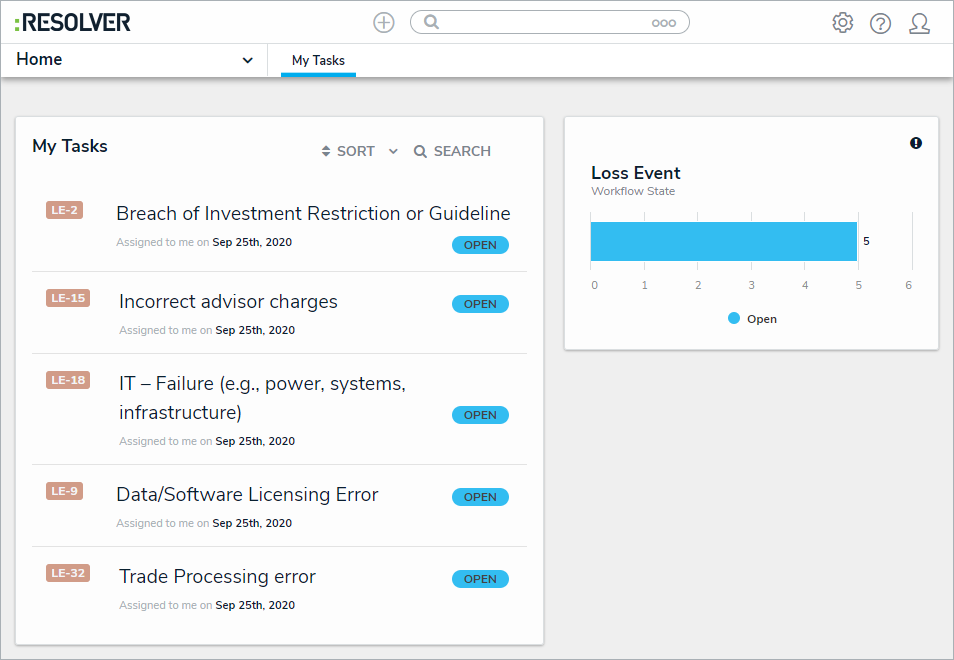 Log into an account from the Loss Event Owners user group to display the My Tasks page.