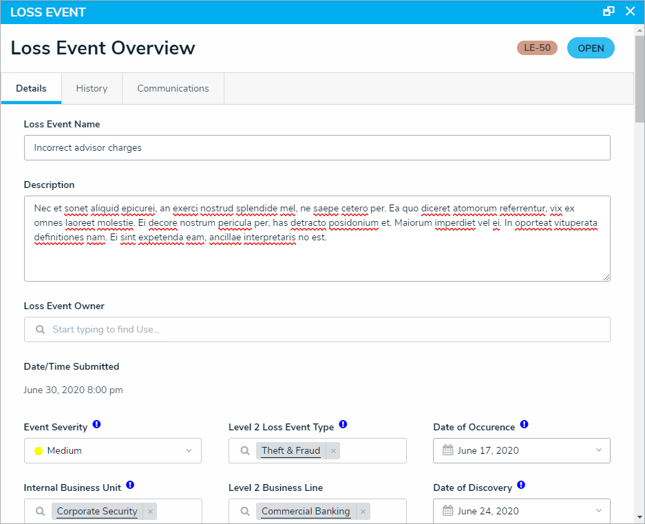 Click a Loss Event to display the Loss Event Overview form.