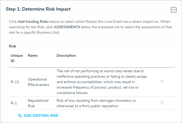 In the Determine Risk Impact section, click Add Existing Risk and begin typing in keywords.