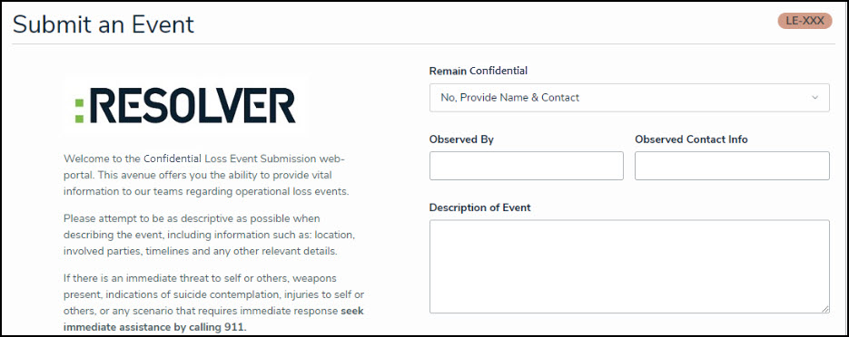 The Submit an Event Confidentially form.