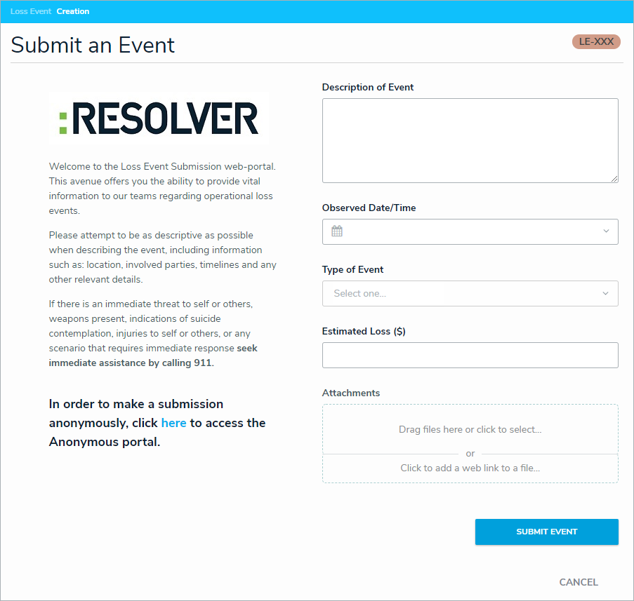 Click New Loss Event to open the Submit an Event form.