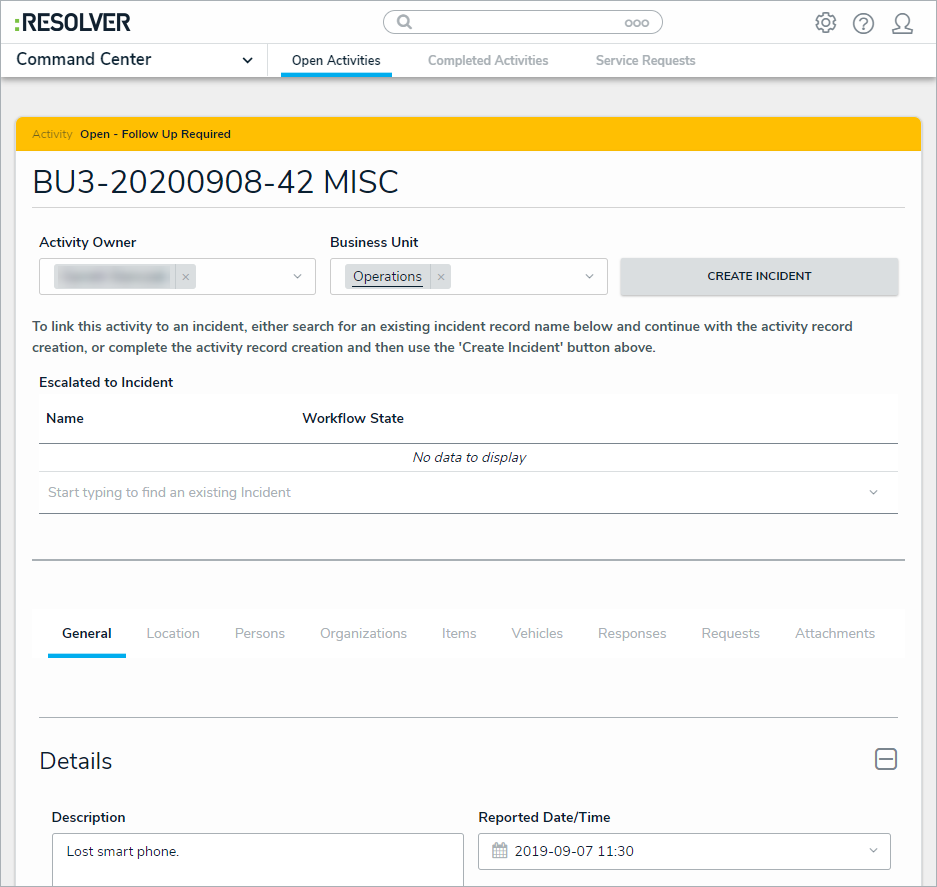 | If an activity was created from the Dispatch application, some fields in the activity will be auto populated based on the details recorded in the dispatch. |