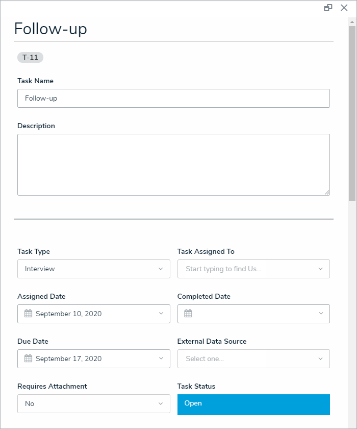 Creating a new task. To unlink the task from the activity, click the X beside it in the table. Note that removing the task from the activity does not delete it from Command Center or from the assigned user's list of tasks. To edit a tasks' details, click any data in the table (e.g., officer name), then click it again from the palette that appears to right of the screen. Editing a task will allow users to enter in additional details such as the assigned user and the external data source.