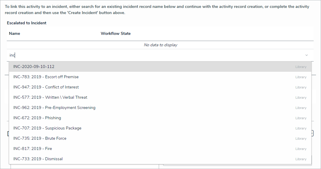 You can create new incidents or link existing incidents to the activity through the Incident section of the form. To link an existing incident to the activity, begin typing keywords in the textbox below the incident table, then click an incident to select it.