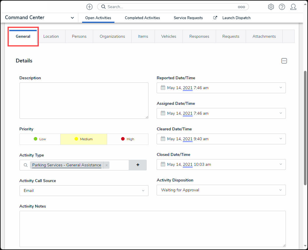 The Details section on the General tab, allows you to add or revise specific details of the activity, including: