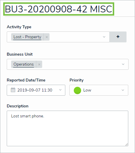 For example, if a new activity was created for lost property on September 8, 2020, in Business Unit 3 - Operations, the object would be saved with a title similar to BU3-20200908-42 MISC. Note that these titles are automatically generated and cannot be edited.