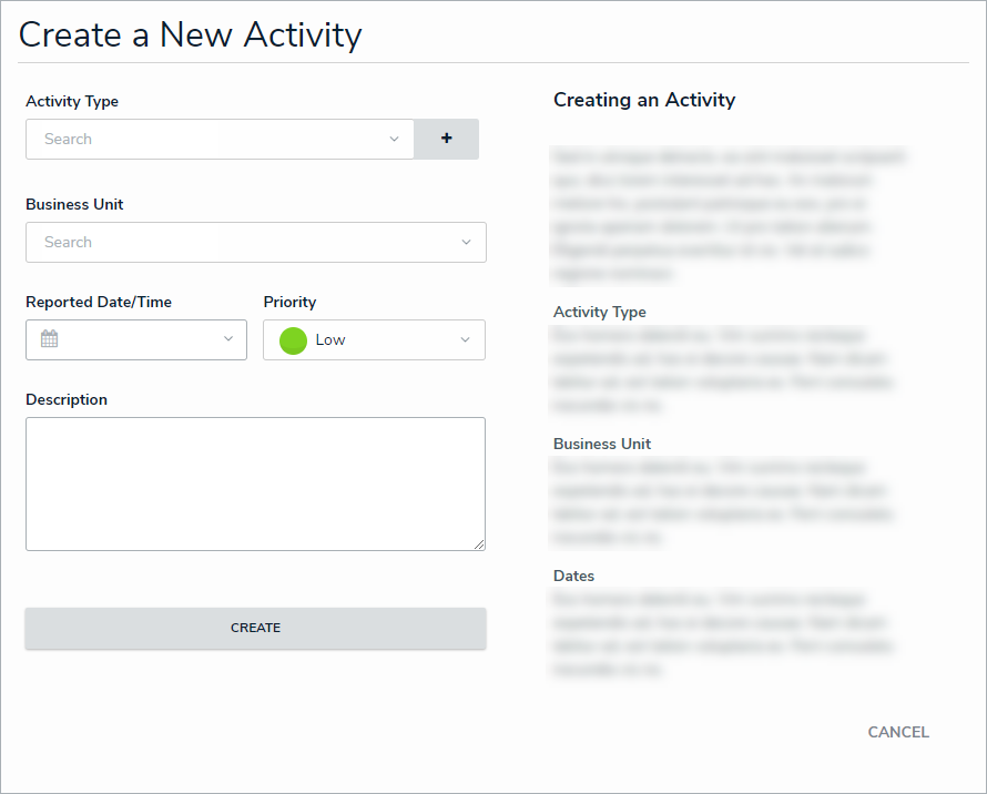 The activity's basic information can be edited after clicking Create, but specific details, including key dates, responses, tasks, involvements, etc. can be reviewed and added from the Open Activities section. See the Open Activities section for further information and instructions.