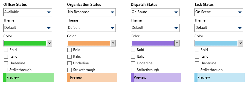 - Officer status (i.e., Available, Assigned, On Route, On Scene, Busy)