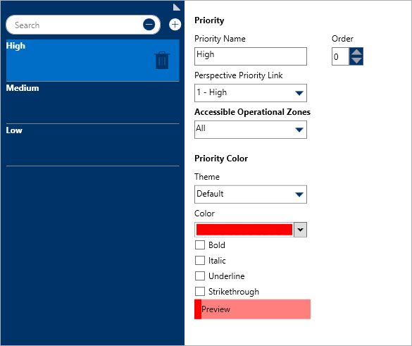 Priorities are the level of importance assigned to a dispatch. You can create unique names for the priorities as they appear in Dispatch, adjust their order, create visual alerts, and control who can access the priorities based on their accessible operational zone.