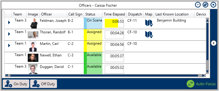 With auto-focus enabled, it automatically selects the associated officer in the panel. This is done by clicking an officer task in the Dispatches panel, an officer on the Map, or a task on the Map. This icon appears greyed out when auto-focus is disabled. |