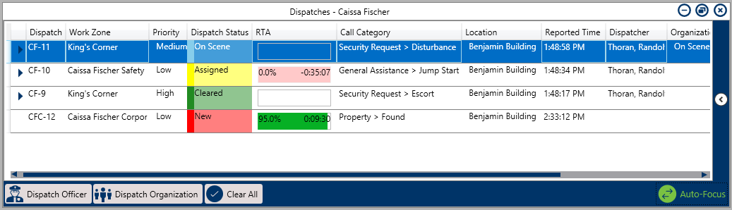 - Dispatch Status: The status of the dispatch, which can be New, Unassigned, Assigned, On Route, On Scene, and Cleared.