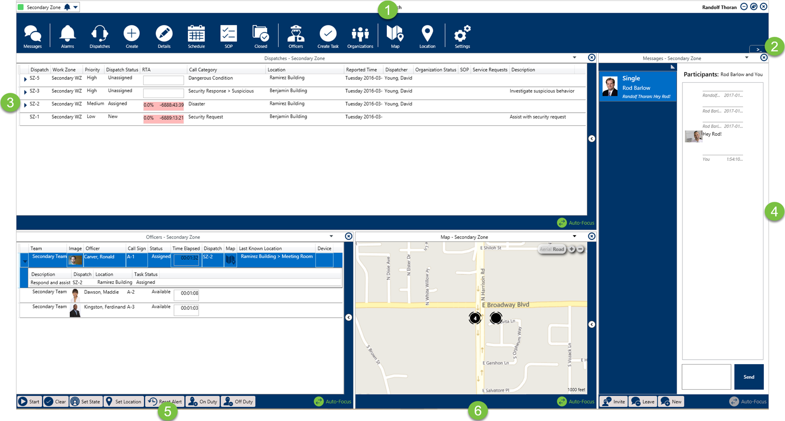 The Dispatch home screen (the main working area within the application) includes a ribbon with quick access to the most common functions, along with a number of panels, including Dispatches, Officers, Maps, and Messages.