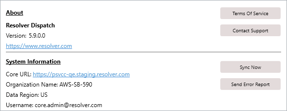 The About section of the Settings provides information about your version of Dispatch, as well as links to the license agreement, legal notice, and Resolver Support site.