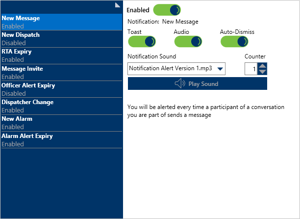 The Notifications settings allow you to turn notifications on or off, enable pop-up or audio notifications, select an audio alert, and specify how many times the audio notification will play.