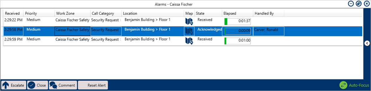 If your organization uses Connect and alarms detected by your security system(s) are configured to be sent into Dispatch, the Alarms panel allows you to perform additional actions on those alarms. From this panel, you can escalate, close, or comment on alarms.