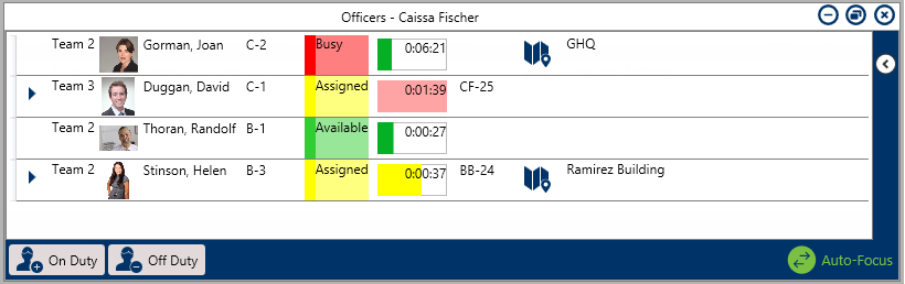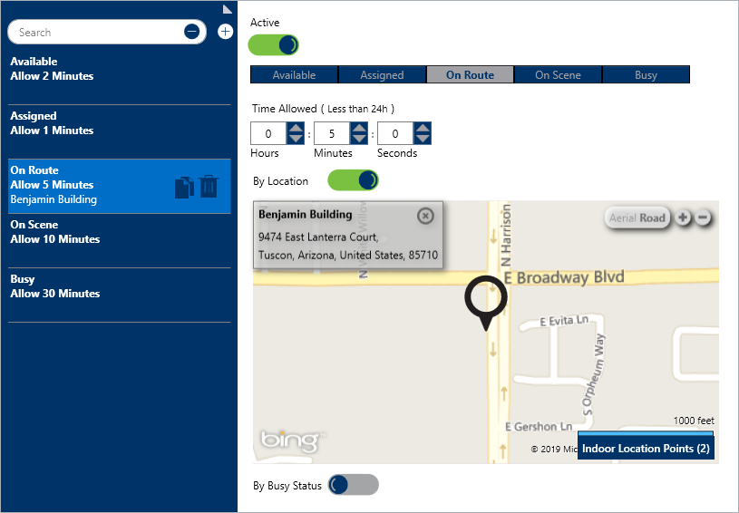 Similar to RTAs, officer alerts determine the amount of time that is allowed for an officer to be in a certain status (i.e. Available, Assigned, On Route, On Scene, or Busy). Officer alerts can also be created based on the location and busy status of the officer (e.g. Break, Emergency, Lunch).