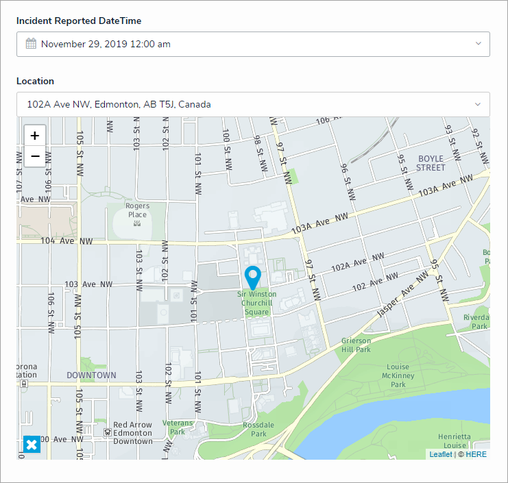 The Location property allows users to record and view the location of an object through an address field, pins on a map, or both, on a standard configurable form. Through this feature, users can visualize where events or incidents are occurring to help identify high-risk areas.