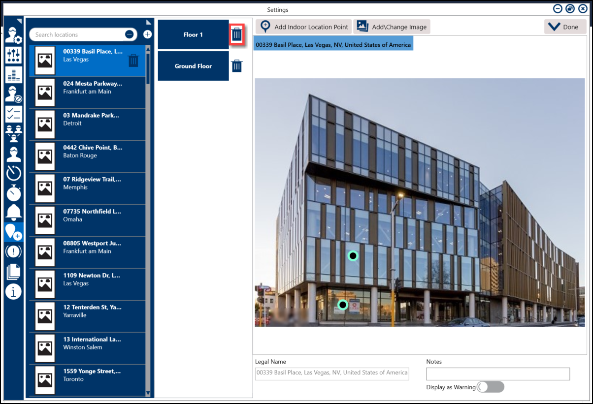 - From the Indoor Location Point screen, click the Delete icon next to an Indoor Location Point.
