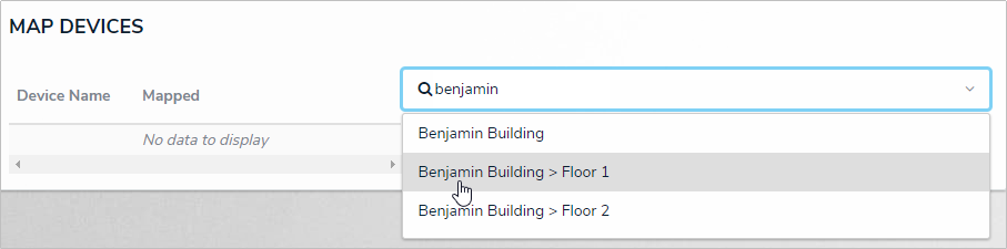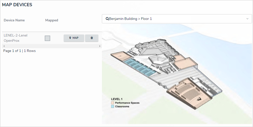 Once a location is selected, its floorplan or map image is displayed along with icons representing any previously mapped devices. The section to the left of the floorplan or map displays all devices that are currently linked to the location and a selected checkbox in the Mapped column indicates the device is already mapped and has an icon placed on the location image.