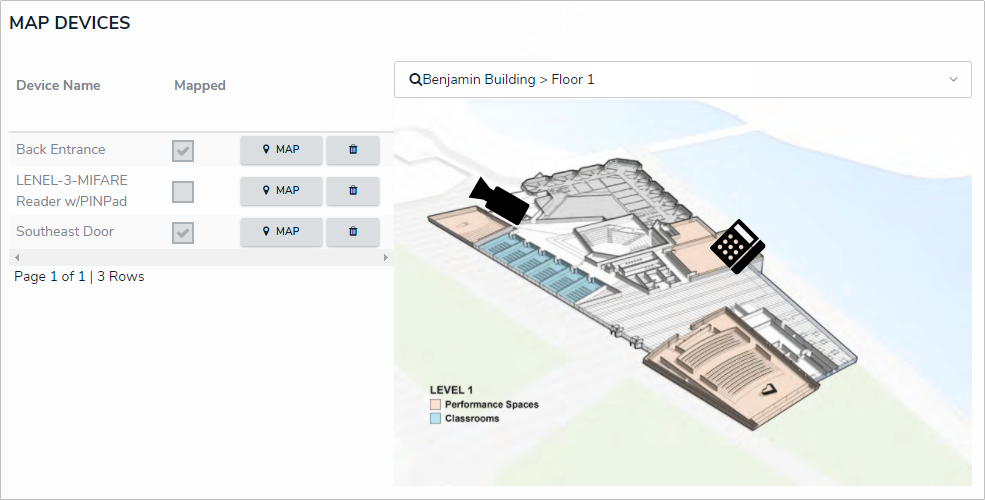 Once your devices have been registered and linked to a Dispatch location or indoor location, you can place a device icon on the associated location’s image to indicate where the device is situated. Device icons also appear in the Map and Location panels in Dispatch and are represented by a pin pad icon for Access Control devices or a security camera icon for Camera devices.
