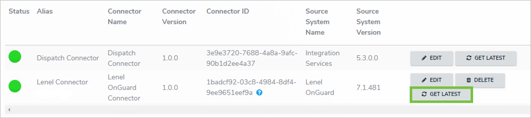 - A green circle in the Status column and a Get Latest button on the connector row in the table indicates the connector is running and is properly configured.