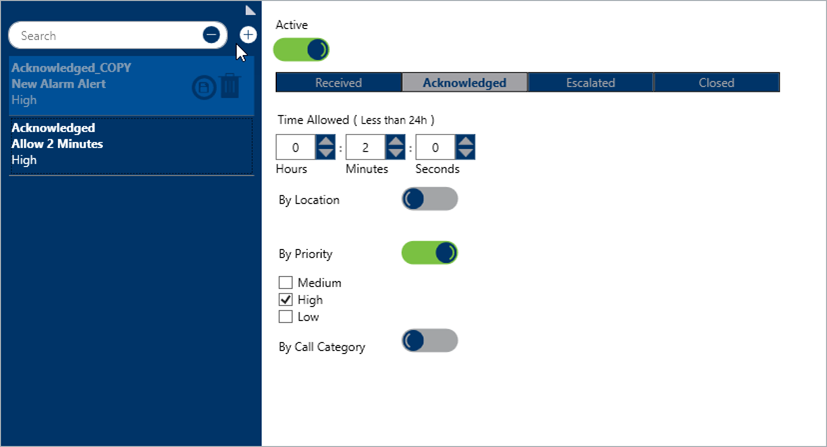 Administrators can create duplicates of existing alarm alerts. These duplicates include the status, time limit, location, priority, and call category settings of the original, which can be adjusted as required.