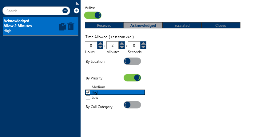 For example, if you created an officer alert for an alarm in the Acknowledged state with a Time Allowed of two minutes, once the dispatcher marks the alarm as Acknowledged, a timer will appear in the Elapsed column of the Alarms panel that will begin counting down from 0:00:00 to 0:02:00, indicating that the dispatcher has two minutes to either escalate the alarm or close it.