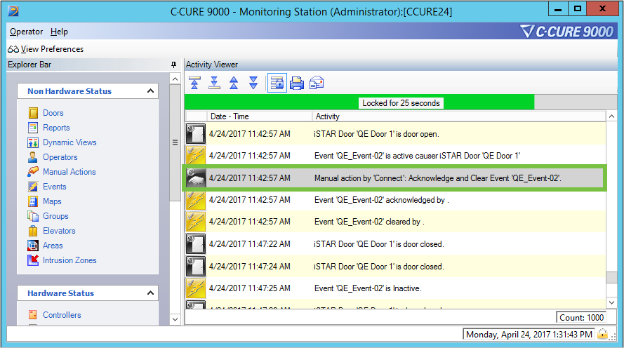 When an event is triggered and processed through Connect, the C-Cure Monitoring Station receives an acknowledge, clear, or an acknowledge and clear activity (depending on the event’s rule settings in Connect).