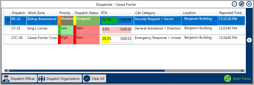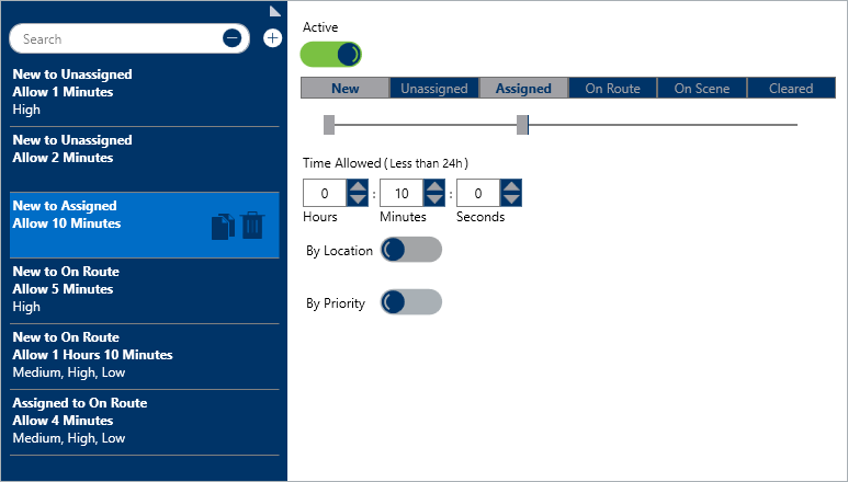 For example, if you created an RTA that requires a dispatcher change the status from New to Assigned within ten minutes for high priority dispatches, once a high priority dispatch has been created, the dispatcher will see a green timer on the Dispatches panel that will count down from 0:10:00.
