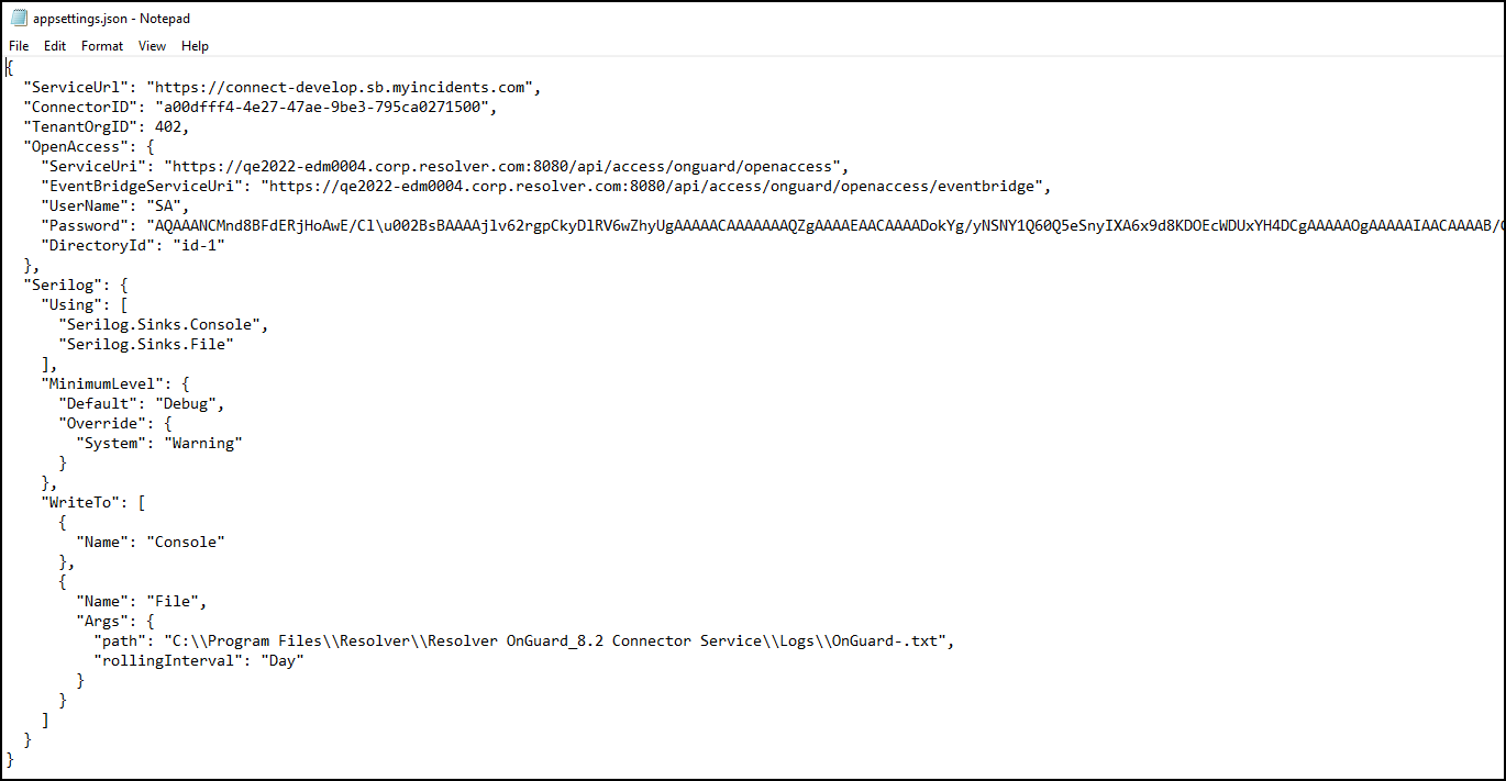 Note: Ensure your changes match the settings configured in the Connect appsettings.json file and are entered within the quotation marks after the semi-colon for each setting. |
