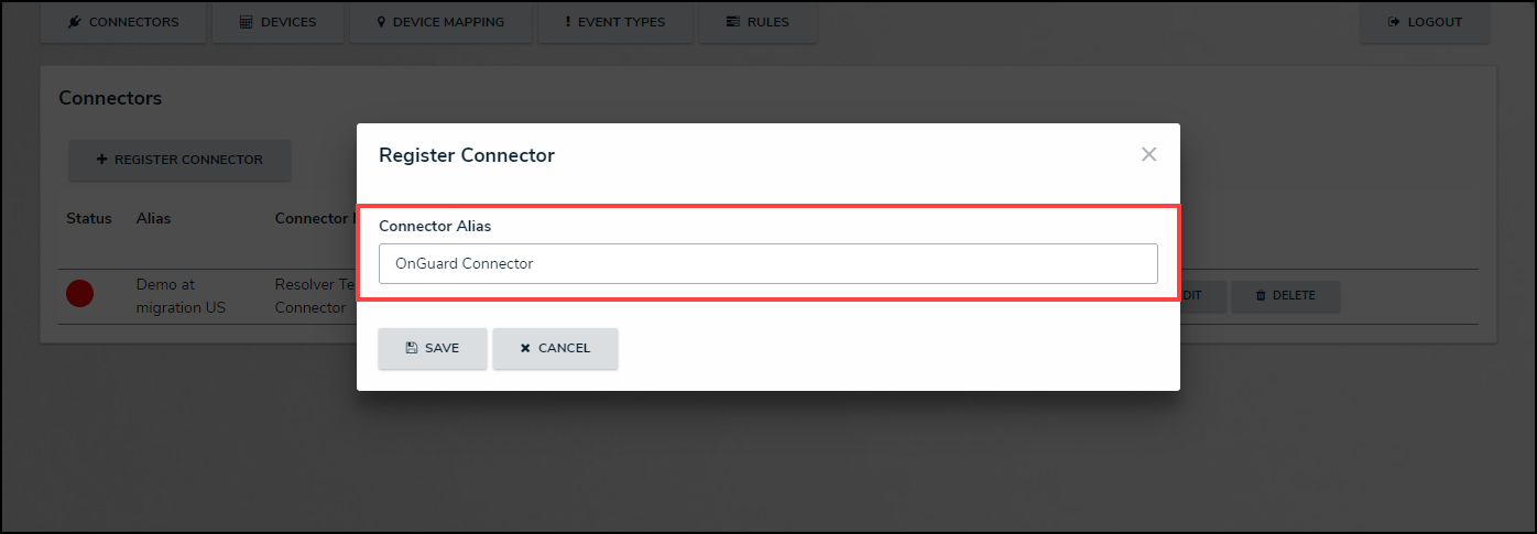 - From the Register Connector screen, enter a name for the connector in the Connector Alias field.