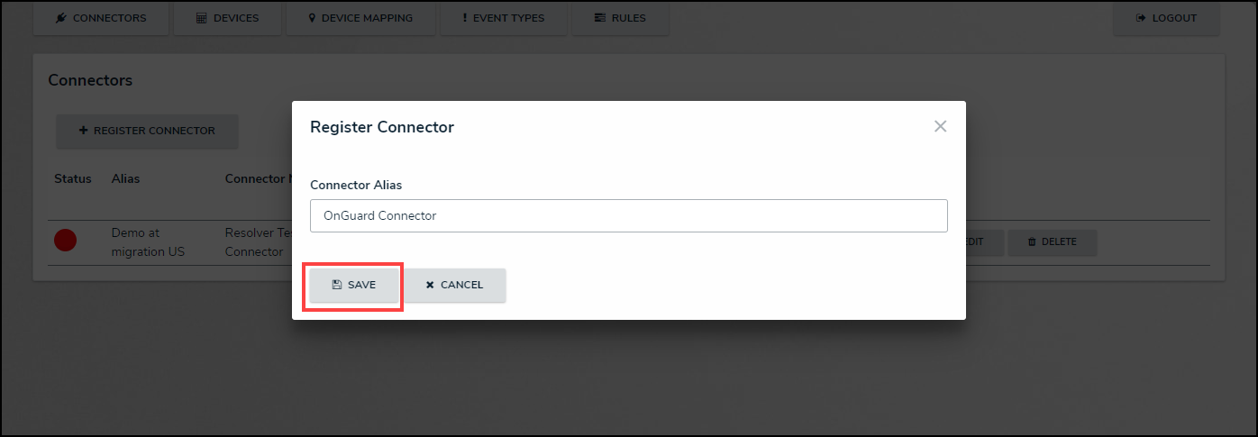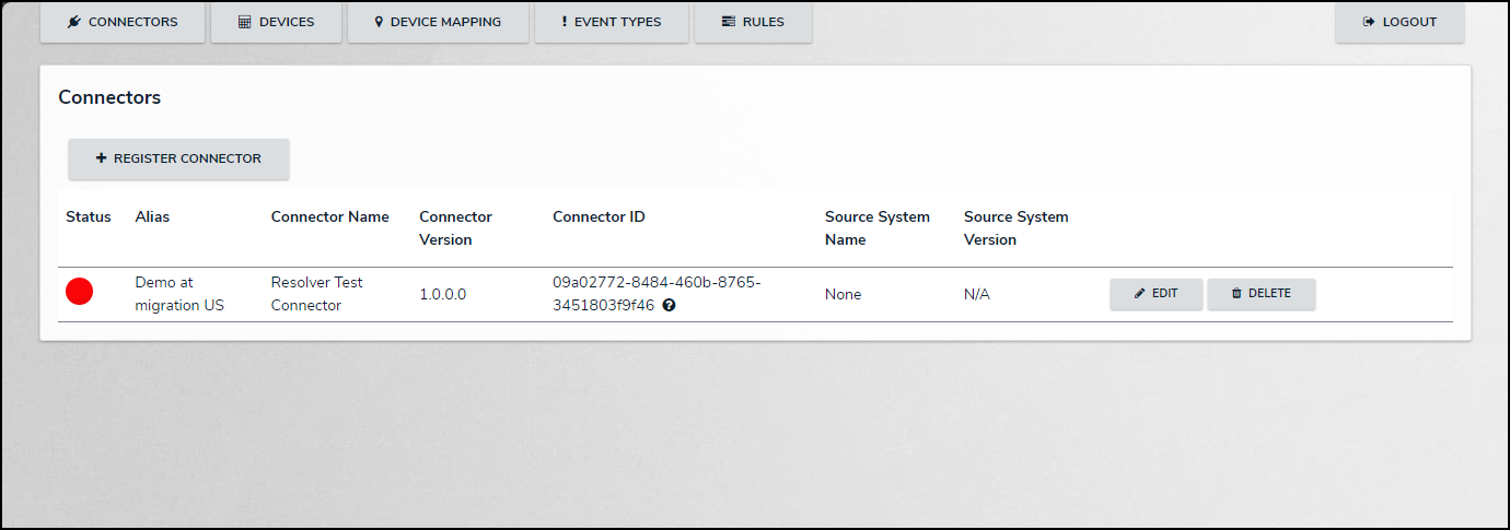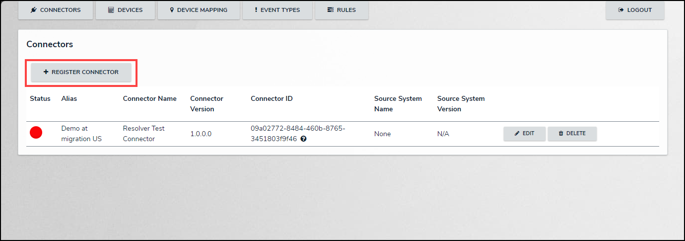- From the Connectors screen, click the + Register Connector button.