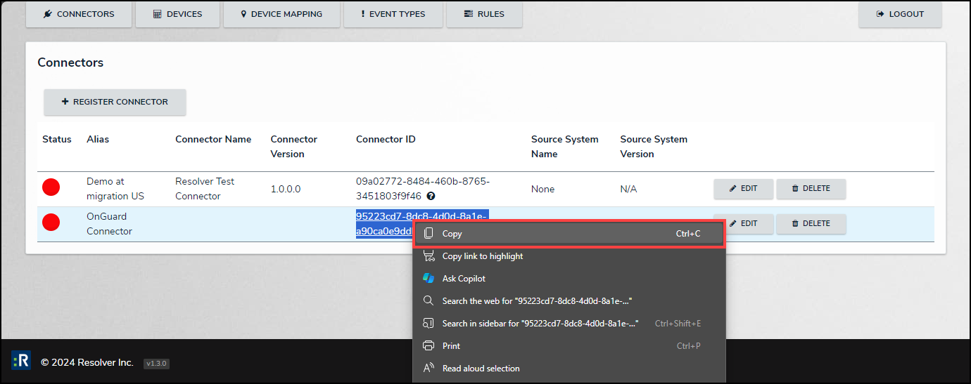 - Highlight the code in the Connector ID column beside the new connector, hover your cursor over the ID and click the right mouse button, then select Copy to copy the code to your clipboard.