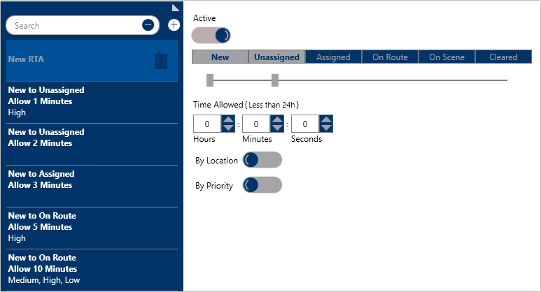 The sliders in the RTA settings that specify a dispatcher has a set amount of time to change a dispatch status from New to On Route.
