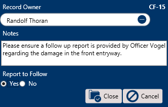 Optional: Click the radio button next to Yes if a follow up assignment or report is required after the dispatch has been closed. When this option is selected, the activity is created in Command Center in an Open - Follow Up Required state. Otherwise, the activity will be in a Closed state.
