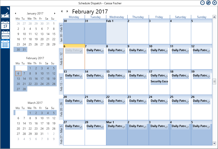 The Scheduled Dispatch panel contains three different calendars for viewing scheduled Dispatches. The Daily Calendar displays an hourly list of any scheduled dispatches for a selected day, the Weekly Calendar displays a list of any scheduled dispatches for a selected week, and the Monthly Calendar displays a list of any scheduled dispatches for a selected month for the current year or future years.